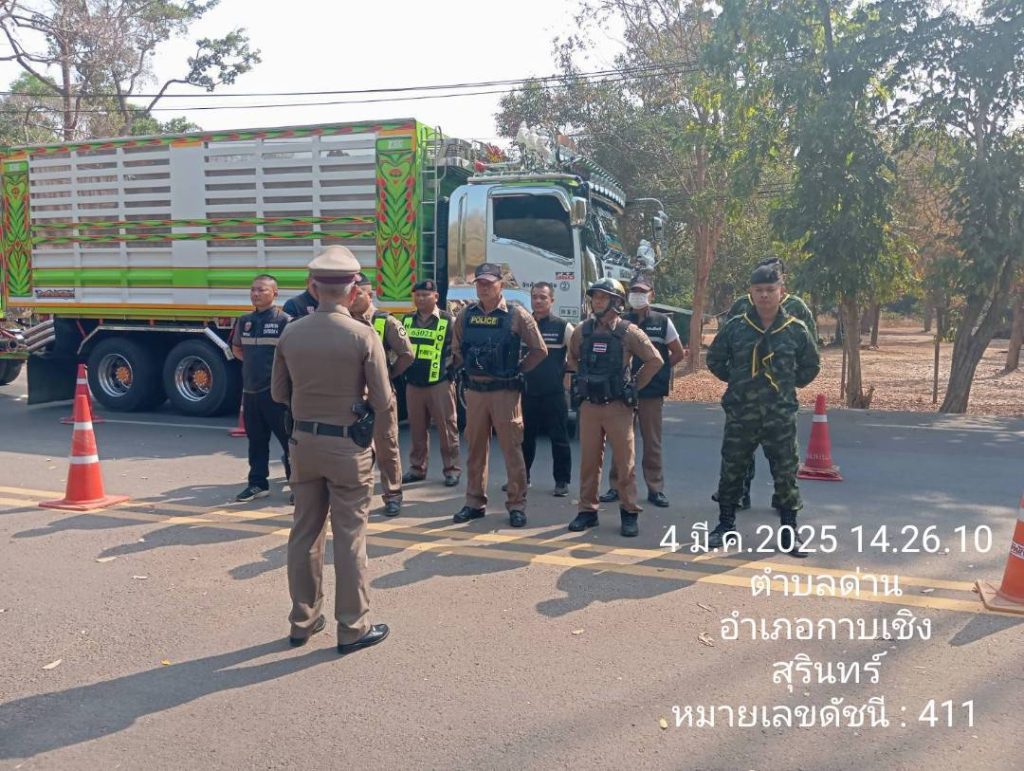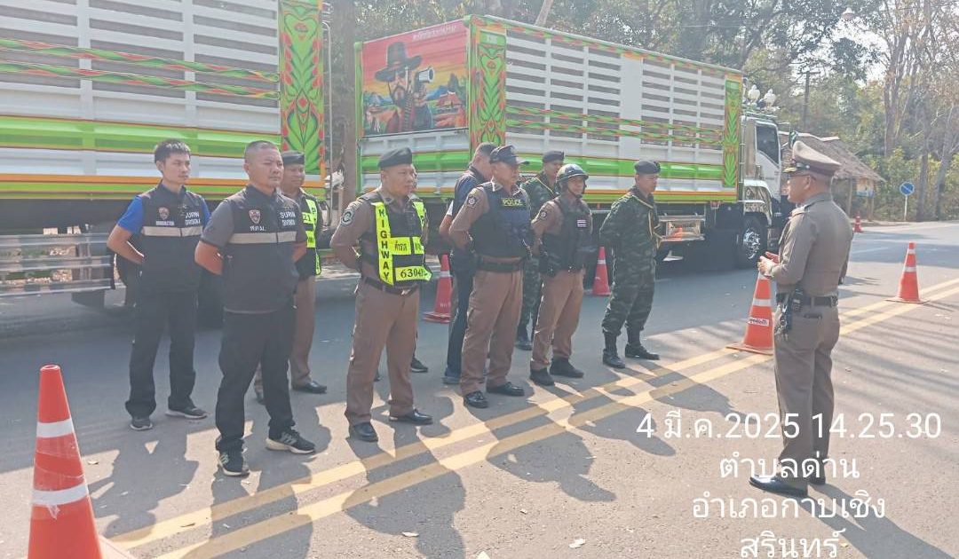 เมื่อวันที่ 4 มี.ค. 68 เวลา 14.00 น. พ.ต.อ.คำพล โนนุช ผกก.สภ.กาบเชิง พ.ต.ท.กิตติภพ ศรณ์แสงคำ รอง ผกก.ป.ฯ พ.ต.ต.วีรชน กะการดี สวป.สภ.กาบเชิง พร้อมสายตรวจรถยนต์ รถจักรยานยนต์ สายตรวจจราจร เจ้าหน้าที่ตำรวจชุดสืบสวน ร่วมกับเจ้าหน้าที่ฝ่ายปกครองอำเภอกาบเชิง ผบ.ฉก.2 กองกำลังสุรนารี เจ้าหน้าที่ตำรวจทางหลวง และเจ้าหน้าที่ตำรวจตรวจคนเข้าเมือง ร่วมกันตั้งจุดตรวจ/จุดสกัด ซึ่งเป็นมาตราการในการแก้ไขปัญหาต่างด้าว ณ บริเวณฐานกลาง บนถนน 214 ใกล้จุดผ่านแดนช่องจอม ต.ด่าน อ.กาบเชิง จ.สุรินทร์ แต่เวลา 14.00 – 16.00.น. ผลการปฏิบัติดังนี้.