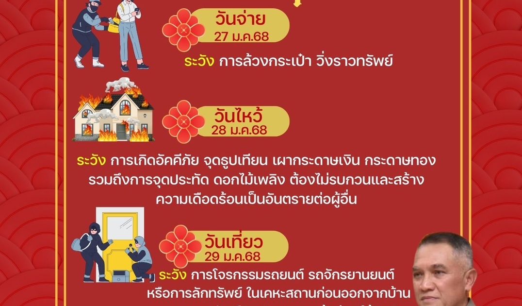 ระวังภัยเทศกาลตรุษจีน 3 กุมภาพันธ์ 2568 โดย kabchoeng_kn2568 / ข่าวประชาสัมพันธ์,ข่าวประชาสัมพันธ์,ข่าวฝากประชาสัมพันธ์ FacebookFacebookXXLINELine
