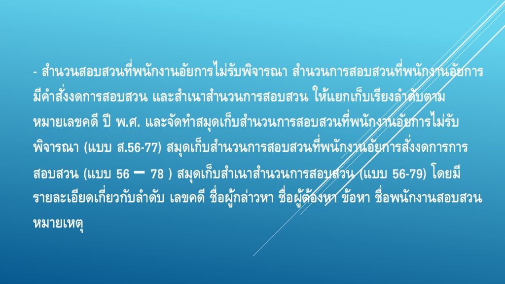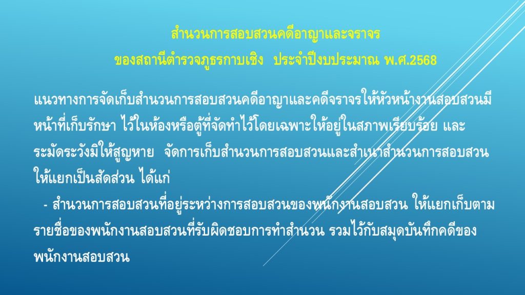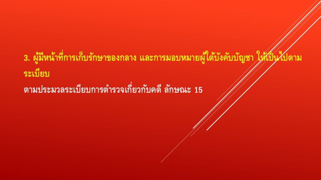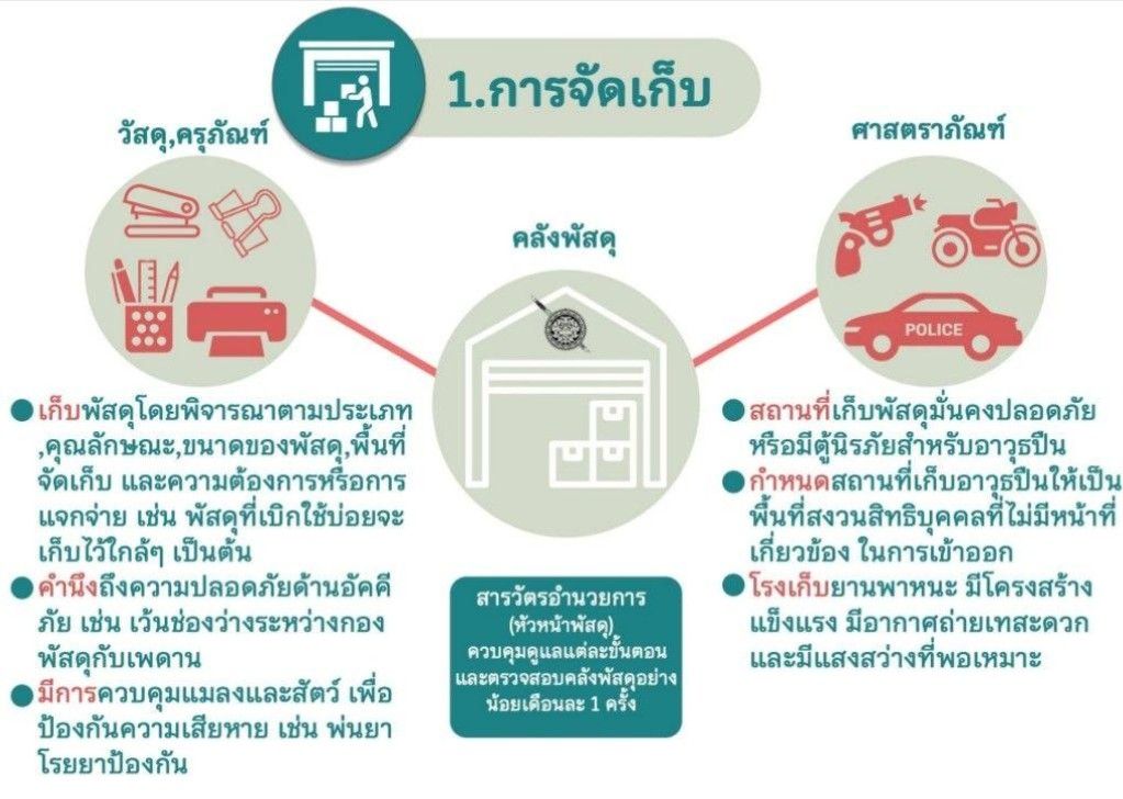จัดทำห้องเพื่อจำแนกประเภททรัพย์สินของทางราชการ อาวุธยุทธภัณฑ์ ของบริจาค  และของกลาง  เป็นสัดส่วน  เป็นระเบียบ